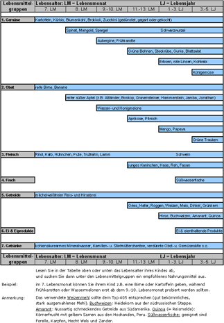 Wurde dieses neu gefütterte Nahrungsmittel gut vertragen, können Sie in der nächsten Woche ein weiteres Nahrungsmittel zufüttern, auch wieder in täglich langsam ansteigenden Mengendosierungen über eine Woche. So ergänzen Sie langsam wochenweise die Aufbaunahrung Ihres Kindes (siehe Abbildung Seite 3).