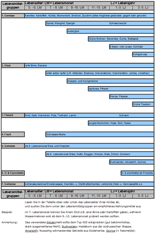 Mit dem 5. Lebensmonat (spätestens jedoch nach dem 6. Lebensmonat) sollte zunächst mit Karotten, Kartoffeln, weiterem Gemüse und Obst in ansteigenden Mengen begonnen werden (siehe Tabelle am Ende der Praxisinformation).