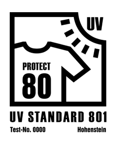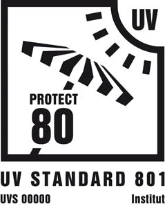 Kinderhaut ist solche Kleidung empfehlenswert. UPF-Gütesiegel - die der Kleidung in der Regel angeheftet sind - gibt es von den verschiedenen Herstellern in verschiedenen Formen und Farben. Größere Beschattungstextilien (wie etwa Sonnenschirme, Markisen, Campingzelte) können bezüglich ihrer Lichtdichtheit mit einem eigenen Logo nach "UV Standard 801" gekennzeichnet sein. Siehe Bild: |
