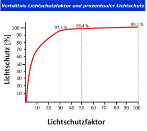 Das exponentielle Verhältnis zwischen LSF und prozentualem Lichtschutz gilt natürlich auch umgekehrt (siehe Grafik rechts). Dies ist der Grund, warum mit einem Lichtschutzfaktor von 30 nur 1,1 % (!) weniger Lichtschutz gegeben ist als mit einem Lichtschutzfaktor von 50. |
