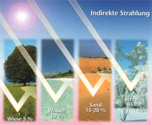 Wichtig ist, dass Sie Schutzmaßnahmen auch im Schatten ergreifen sollten. Die lichtschützende Wirkung von Schatten, Wolken, Nebel wird häufig überschätzt. So reduziert ein Sonnenschirm am Strand das UV-Licht nur auf die Hälfte, da es zum großen Teil durch den hellen Sand reflektiert wird. Auch ein leicht wolkenverhangener Himmel kann zum Sonnenbrand führen, da eine dünne Wolke die UV-Strahlung der Sonne nur um 20 – 40 % reduziert und durch die Umgebung wie Wasser, Sand oder Schnee die UV-Strahlung zusätzlich reflektiert und damit verstärkt wird. |