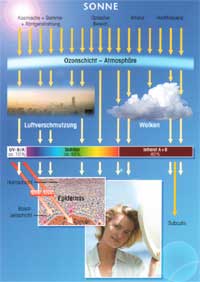 Das Leben auf unserer Erde, so wie wir es kennen, wurde und wird ermöglicht durch ein Kraftwerk, das von 150 Millionen Kilometer Entfernung unseren Planeten mit der nötigen Lebensenergie versorgt: die Sonne. Erst wenn die Sonne scheint, fühlen wir uns so richtig wohl. Die Sonnenstrahlung bringt Kreislauf und Stoffwechsel in Schwung, die Bildung von Vitamin D -wichtig für den Knochenaufbau- wird angeregt, unsere Stimmung und Lebenslust werden gesteigert. Sonnenlicht besteht aus einem Spektrum verschiedener sichtbarer und unsichtbarer Strahlenarten. Der größte Anteil stellt mit 50 % das sichtbare Licht dar, gefolgt vom Infrarotlicht mit 40 % Anteil, das wir subjektiv als Wärme empfinden. Obwohl das unsichtbare Ultraviolett-Licht nur 10% ausmacht, scheint diese Strahlung für die Entstehung von Hautkrebs ein wichtiger Faktor zu sein, neben einer Reihe anderer Faktoren, die ebenfalls hautkrebsfördernd sind. Siehe hierzu auch Praxisinformation Nr. 17
